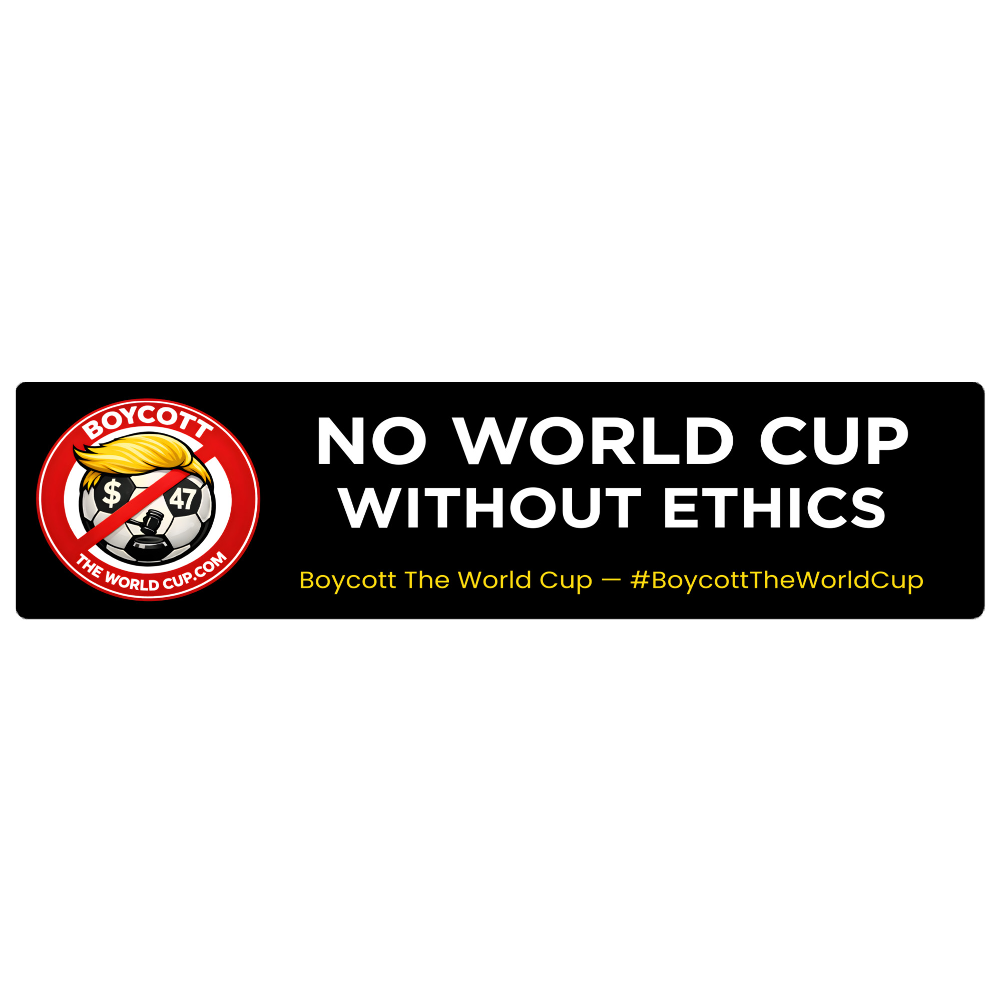 Stand out and make your message clear with this 15″x3.75″ bumper sticker. Featuring the slogan “NO WORLD CUP WITHOUT ETHICS,” this sticker highlights corruption and questionable decisions surrounding the 2026 World Cup.