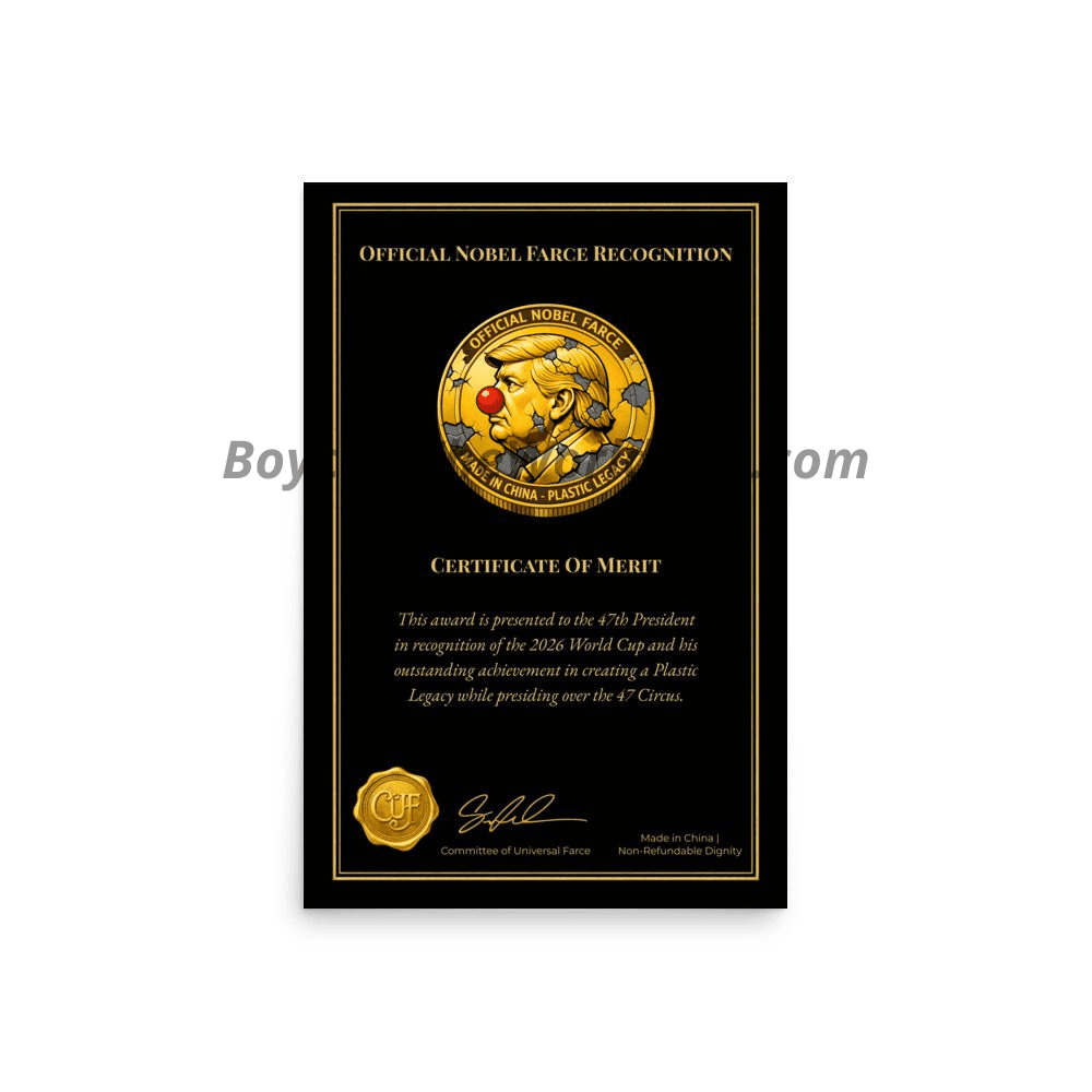 This isn’t just a poster; it’s an “official” recognition of the most theatrical era in modern history. Commemorating the 2026 World Cup and the 47th President’s unparalleled achievement in creating a “Plastic Legacy,” this Nobel Farce Recognition poster is the definitive centerpiece for any room or office.